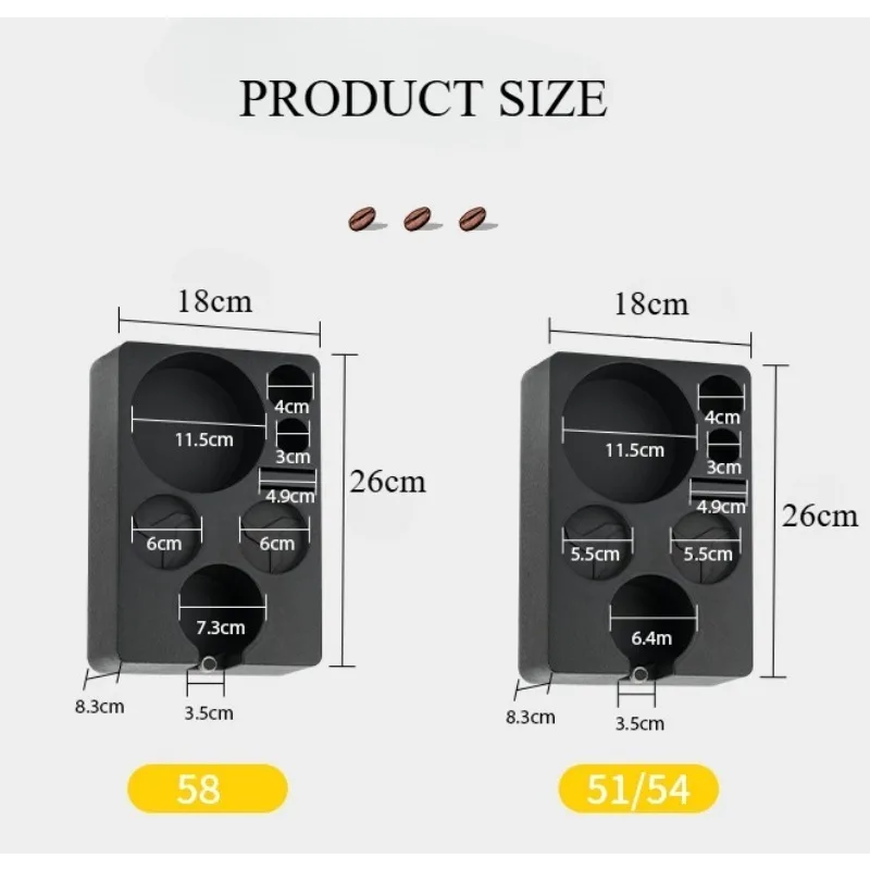 - Tamper station 51-54 mm: this espresso coffee station is suitable for various types of 51-54 mm portafilter accessories. Please measure the size of your coffee tools before purchasing to make sure they fit our tamper station. If the size does not fit, please buy carefully.